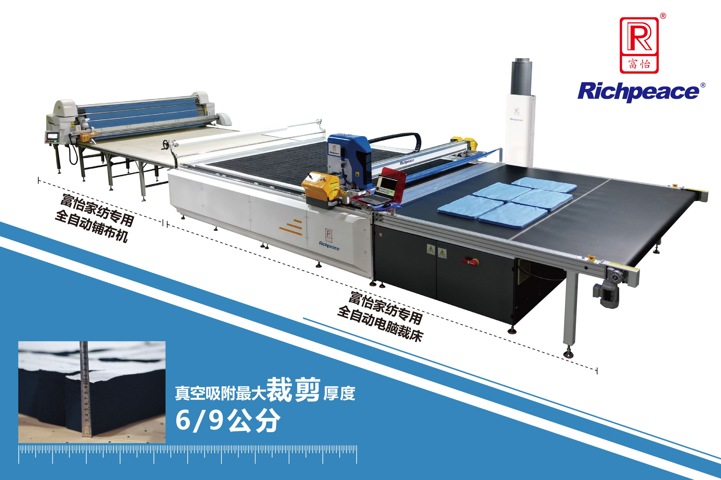 | 型號 | 推薦型號—鋪布機 RPSM-WF-1-1000×2500-C-W100-NA-1P220 RPSM-WF-1-1000×2800-C-W100-NA-1P220 RPSM-WF-1-1000×3000-C-W100-NA-1P220 RPSM-WF-1-1000×3200-C-W100-NA-1P220 推薦型號—電腦裁床(其他型號可支持定制) RPAC-NM-MC6/9-1-2600×2600-SB-MH-P-3P380 RPAC-NM-MC6/9-1-2500×3200-SB-MH-P-3P380 |