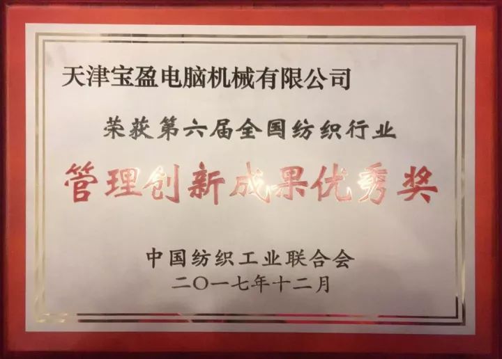 天津?qū)氂娔X機(jī)械有限公司榮獲“第六屆全國紡織行業(yè)管理創(chuàng)新成果優(yōu)秀獎”。王俊玲總經(jīng)理,獲得“管理創(chuàng)新成果主創(chuàng)者”稱號。
