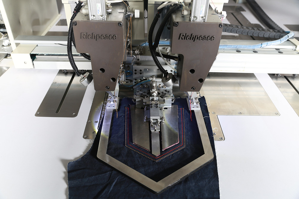 增加兩套獨立機頭裝置,實現了雙色縫紉的全自動雙色自動折邊