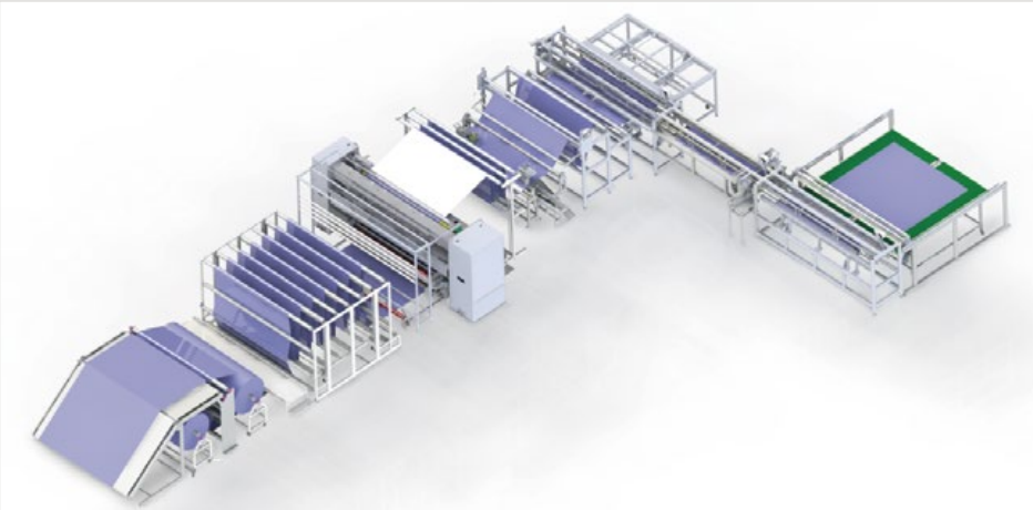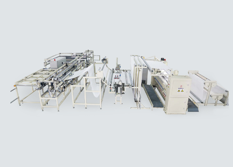 1、由來料儲料調節控制機構,可調寬度的側邊縫制機構,長度可控的橫裁機構,同步控制的橫向輸送機構,自動剪線的橫縫機構和